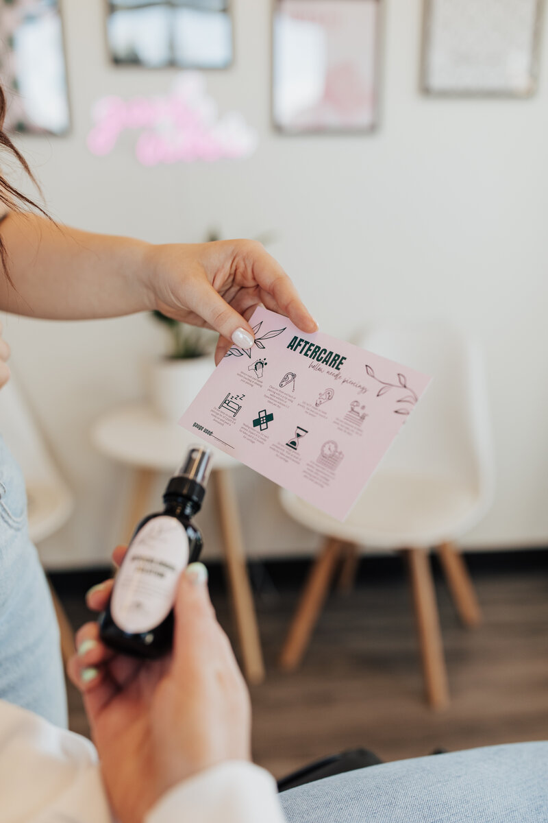 We’ll give you a detailed card with all the instructions. Clean 1–2x a day with a Q-tip using hypochlorous acid (available at the salon) or sterile saline wound wash from any pharmacy. Schedule a post changeout depending on the piercing: cartilage should be changed out 4–8 weeks after, lobes 8–12 weeks. Avoid touching/twisting. No lakes, hot tubs, or pools for 30 days. Healing time: cartilage needs 6+ months to fully heal, lobes take about 12 weeks.